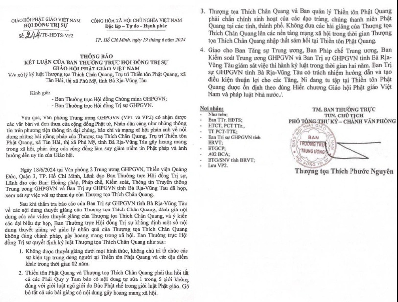 Thông báo kết luận của Ban thường trực Hội đồng trị sự Giáo hội Phật giáo Việt Nam về việc xử lý kỷ luật đối với thượng tọa Thích Chân Quang, trụ trì Thiền tôn Phật Quang, xã Tân Hải, thị xã Phú Mỹ, tỉnh Bà Rịa- Vũng Tàu.