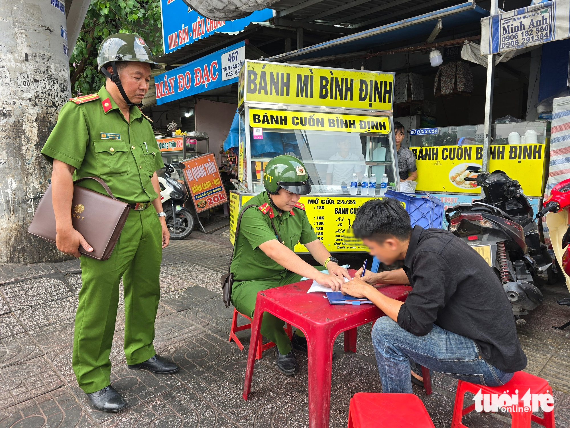 Lực lượng chức năng lập biên bản anh T.T.K. để xe bánh mì lấn chiếm vỉa hè – Ảnh: MINH HÒA