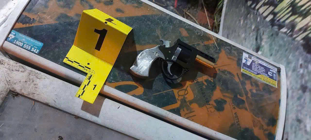 Lực lượng công an đã thu giữ tại hiện trường 1 khẩu súng ngắn dạng rulô tự chế, 1 viên đạn rơi ra ngoài và 3 viên đạn trong ổ đạn của súng.