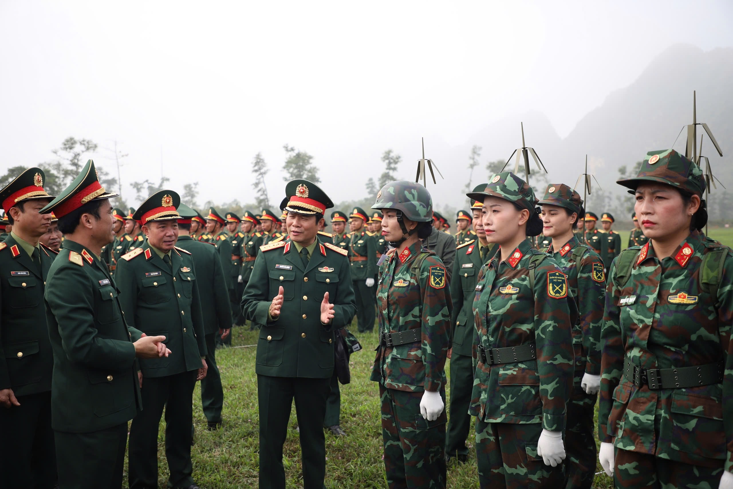 Đại tướng Nguyễn Tân Cương động viên các chiến sĩ tham gia hợp luyện diễu binh vào sáng 4-3