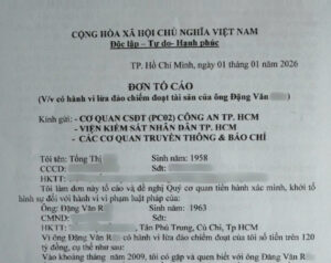 Mới đây, bà Tống Thị H. vừa gửi đơn đến Phòng Cảnh Sát Điều tra Tội phạm về Trật tự Xã hội (PC02) Công an Tp Hồ Chí Minh, tố cáo ông Đặng Văn R., sinh năm 1963, thường trú tại Ấp Bến Đò 2, Tân Phú Trung, Củ Chi, Tp HCM có hành vi lừa gạt, chiếm đoạt tài sản của bà, số tiền lên đến hơn 120 tỷ đồng