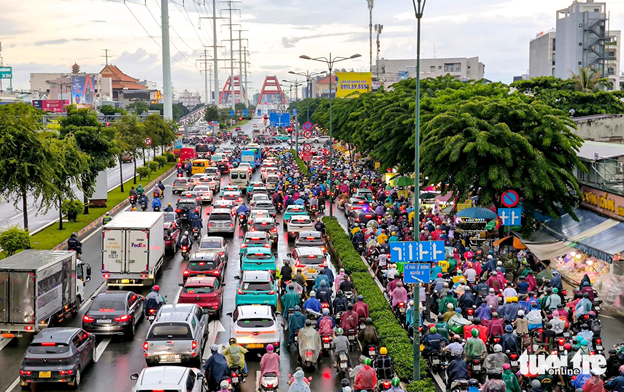 Kẹt xe trên cầu Bình Lợi (hướng từ TP Thủ Đức cũ đến giao lộ Nguyễn Xí – Phạm Văn Đồng) – Ảnh: CHÂU TUẤN